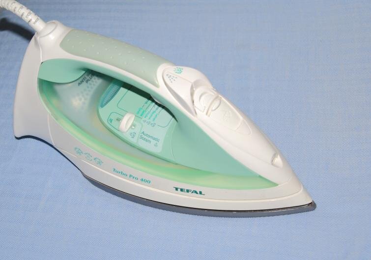 - Нагрейте утюг и нажмите на паровую кнопку, чтобы вытолкнуть пригоревшие остатки из отверстий.